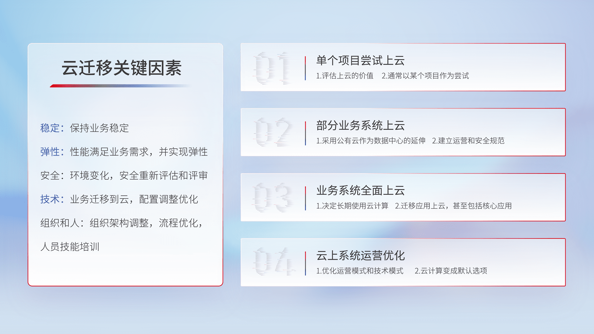 结合实际业务,,从规划设计、、、、云平台选型、、、、云原生改造、、数据迁移、、、、集成交付,,,迁移全过程为客户识别最佳上云路径,,,,做好风险识别管理,,,,设计网络架构、、身份权限、、、安全审计合规、、、操作审计、、、、日志审计、、、监控告警策略、、、、多站点容灾设计等,,,对云上基础设施进行整体规划,,,提升IT治理水平,,,以满足弹性、、、、高可用、、高性能的需求。。