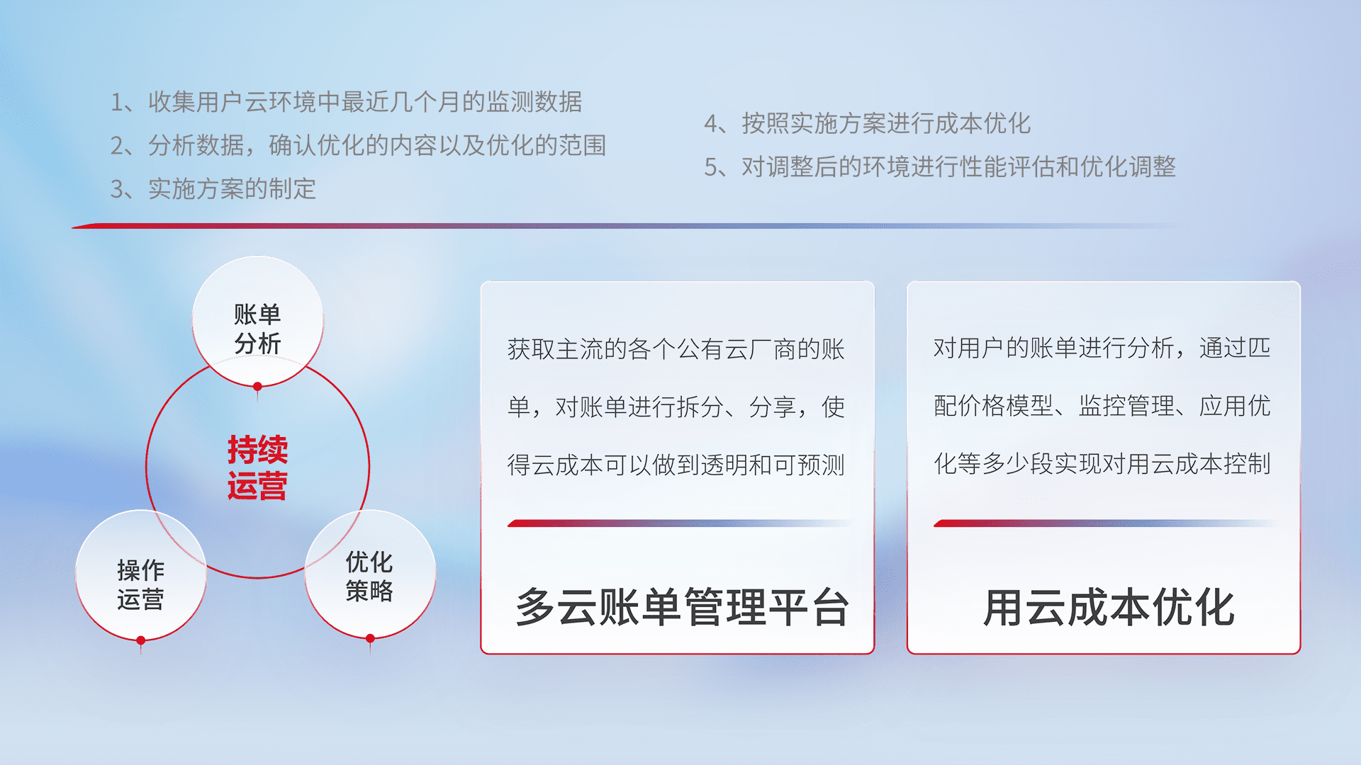 通过多云纳管,,以统一的资源数据模型把客户的云资源进行抽象和封装,,,,进而实现对多云资源的统一操作,,,保障云资源管理的可靠性、、、稳定性与可用性。。量身定制化运维内容,,,,配置、、开发运维、、、、补丁管理、、、、备份、、、、监控、、认证和访问管理、、、、审计和日常巡检等,,,保障在用云过程中的可靠度,,,稳定度以及高可用率。。
